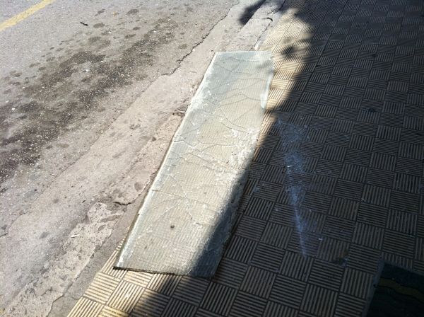 Ξαφνικά ακριβώς δίπλα τους "προσγειώνεται" το κομμάτι τζαμιού, που βλέπετε στη φωτογραφία, το οποίο αποκολλήθηκε από την βεράντα του 1ου ορόφου.