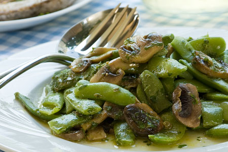 Σκουπίζουμε τα μανιτάρια με ένα νοτισμένο πανί και τα κόβουμε σε λεπτές φέτες. Σε ένα βαθύ τηγάνι ή σε μια κατσαρόλα σοτάρουμε το κρεμμύδι στο ελαιόλαδο για 2-3 λεπτά, μέχρι να μαραθεί. Προσθέτουμε τα μανιτάρια και τα σοτάρουμε σε δυνατή φωτιά. Μόλις ροδίσουν, τα αλατοπιπερώνουμε και τα πασπαλίζουμε με τον κόλιανδρο. Τα αποσύρουμε από τη φωτιά και τα ανακατεύουμε με τα βρασμένα φασολάκια.