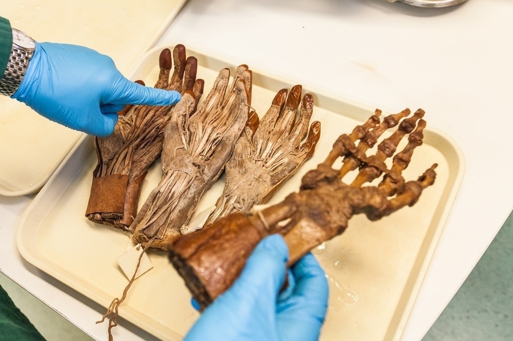 Στην περίπτωση του χεριού, ένα ειδικά εκπαιδευμένο μέλος του προσωπικού έκοψε το χέρι στα κατάλληλα σημεία, έτσι ώστε να αποκαλυφθούν οι απαραίτητοι ιστοί, οι τένοντες και οι μύες. Είναι συναρπαστικό να τα βλέπεις, πόσο μάλλον να τα κρατάς στα χέρια σου - ειδικά ο εγκέφαλος, που είναι το μέρος του σώματός που περνάει τις περισσότερες αλλαγές κατά τη διάρκεια της ταρίχευσης, καθώς αυξάνεται αισθητά το βάρος του.