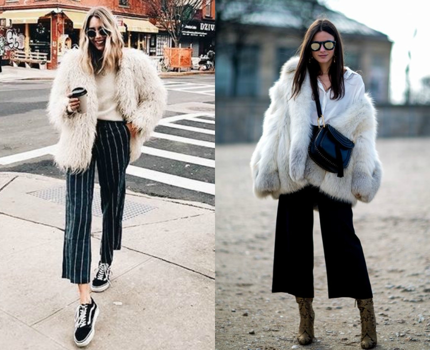 Οι κοντές γούνες ταιριάζουν τέλεια με wide leg pants. Μπορείς να ολοκληρώσεις με sneakers, αλλά και γόβες και να πας με το πρώτο στιλ για καφέ και το δεύτερο για ποτό.