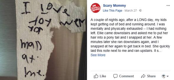 «Πριν λίγο καιρό και έπειτα από μια δύσκολη μέρα, τα παιδιά μου σηκώθηκαν από το κρεβάτι και αποφάσισαν να αρχίσουν να τρέχουν πάνω-κάτω. Ήμουν εξαντλημένη, πνευματικά και σωματικά- ένιωθα ότι δεν μου είχε απομείνει τίποτα. Η Ellie ήρθε κάτω και με ρώτησε αν μπορούσα να πιάσω αλογοουρά τα μαλλιά της κι εγώ της μίλησα απότομα. Λίγα λεπτά μετά, ξανακατέβηκε και την αποπήρα και πάλι λέγοντάς της να πάει πίσω στο κρεβάτι. Μου άφησε βιαστικά αυτό το σημείωμα και έτρεξε πάνω. Έγραφε: “Σ’ αγαπάω όταν μου θυμώνεις”. Σε ένα κομμάτι από χαρτί τουαλέτας.